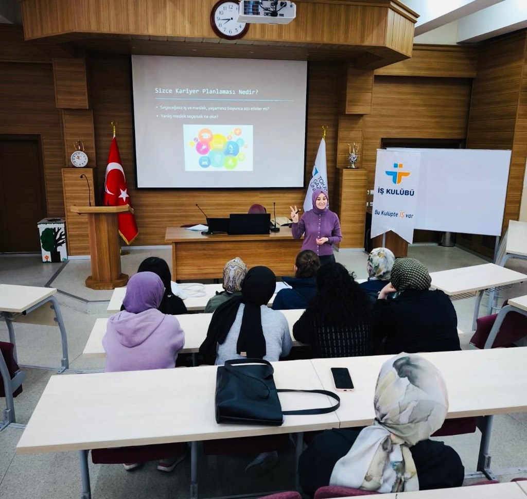 Bu kapsamda; Meslek Yüksekokulumuz Büro Hizmetleri ve Sekreterlik Bölümü Büro Yönetimi ve Yönetici Asistanlığı Programı (I. Grup) öğrencilerine, Türkiye İş Kurumu Tokat İl Müdürlüğünde görevli İş ve Meslek Danışmanları Süheyla Durmuş ve Kadir Çıtak tarafından 23.10.2025 Perşembe günü; "İş Kulübü" faaliyetleri, "Meslek Seçiminin Önemi ve Kariyer Planlama" konularında eğitim verildi.