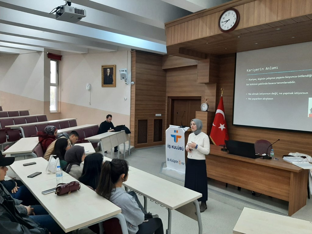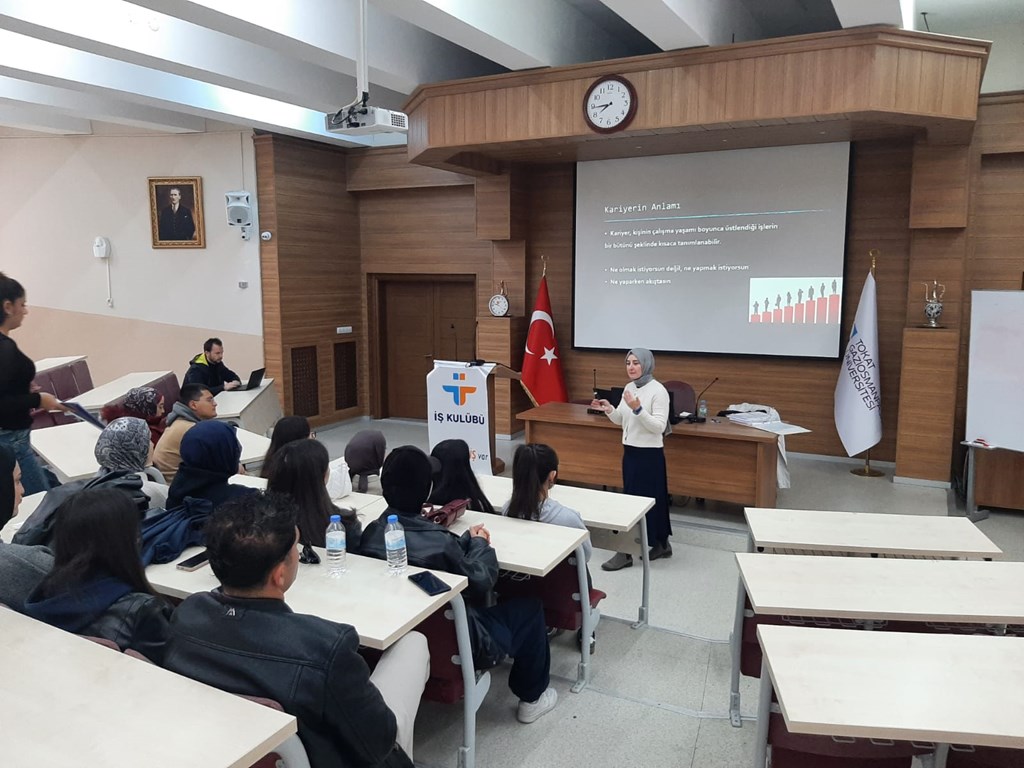 Bu kapsamda; Meslek Yüksekokulumuz Büro Hizmetleri ve Sekreterlik Bölümü Büro Yönetimi ve Yönetici Asistanlığı Programı (II. Grup) öğrencilerine, Türkiye İş Kurumu Tokat İl Müdürlüğünde görevli İş ve Meslek Danışmanları Süheyla Durmuş ve Ertuğrul Kıraç tarafından 04.11.2025 Perşembe günü; "İş Kulübü" faaliyetleri, "Meslek Seçiminin Önemi ve Kariyer Planlama" konularında eğitim verildi.