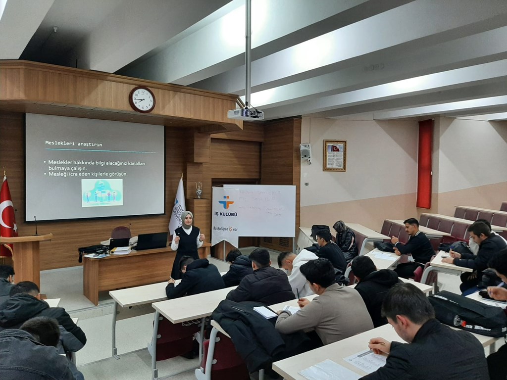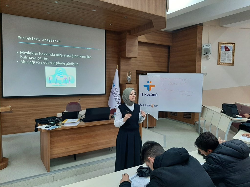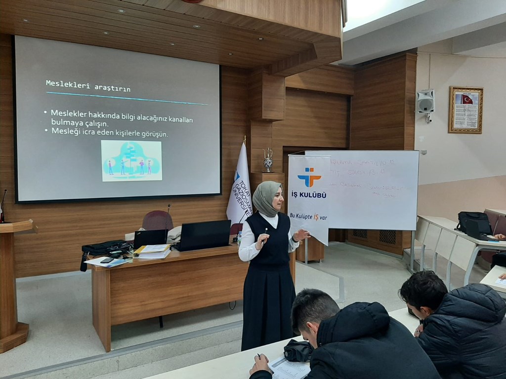 Bu kapsamda; Meslek Yüksekokulumuz Elektrik ve Enerji Bölümü Elektrik Programı öğrencilerine, Türkiye İş Kurumu Tokat İl Müdürlüğünde görevli İş ve Meslek Danışmanları Süheyla Durmuş ve Berru Daldal tarafından 16.12.2025 Salı günü; "İş Kulübü" faaliyetleri, "Meslek Seçiminin Önemi ve Kariyer Planlama" konularında eğitim verildi.