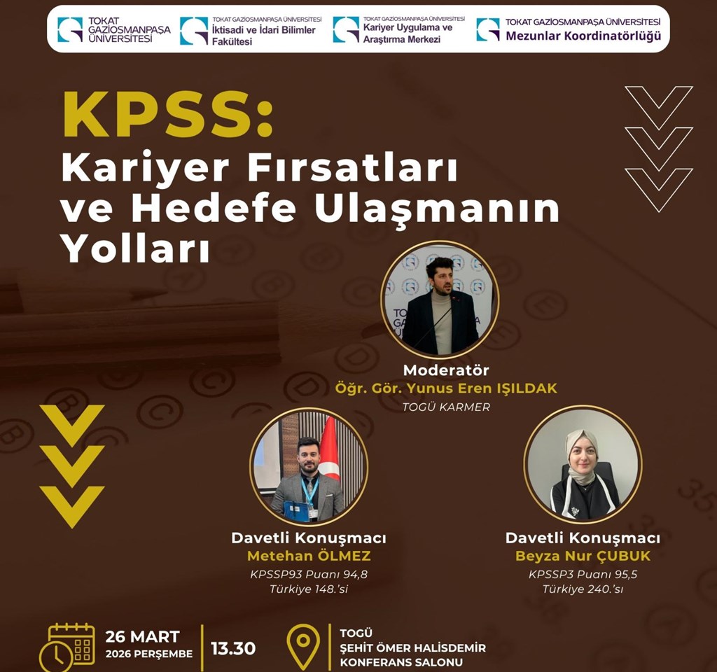 TOGÜ Kariyer Uygulama ve Araştırma Merkezi Koordinatörlüğü ile TOGÜ KARMERD'den Öğr. Gör. Yunus Eren Işıldak Moderatörlüğünde; Davetli Konuşmacılar KPSS Türkiye 148.'si Metehan Ölmez ve KPSS Türkiye 240.'sı Beyza Nur Çubuk'un katılımlarıyla; 26 Mart 2026 Perşembe günü saat 13.30'da, TOGÜ Şehit Ömer Halis Demir Konferans salonunda,