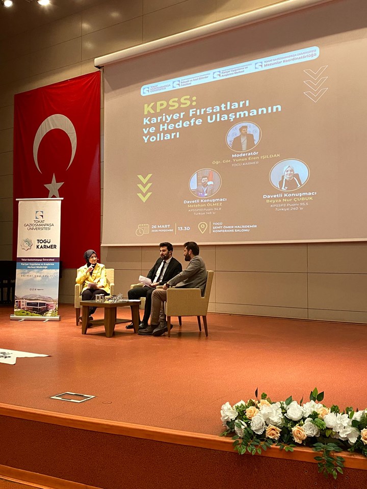 TOGÜ Kariyer Uygulama ve Araştırma Merkezi Koordinatörlüğü ile TOGÜ KARMERD'den Öğr. Gör. Yunus Eren Işıldak Moderatörlüğünde; Davetli Konuşmacılar KPSS Türkiye 148.'si Metehan Ölmez ve KPSS Türkiye 240.'sı Beyza Nur Çubuk'un katılımlarıyla; 26 Mart 2026 Perşembe günü saat 13.30'da, TOGÜ Şehit Ömer Halis Demir Konferans salonunda, "KPSS: Kariyer Fırsatları ve Hedefe Ulaşmanın Yolları" konulu etkinlik düzenlendi.